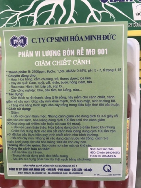 Thuốc giâm chiết cành - Phân bón vi lượng MĐ-901 được cung cấp bởi Công ty cổ phần sinh hóa Minh Đức có tác dụng kích thích cây ra rễ. Thích hợp trong quá trình nhân giống nhiều loại hoa cây cảnh.Một số loài cây nhân giống bằng cách giâm chiết cành