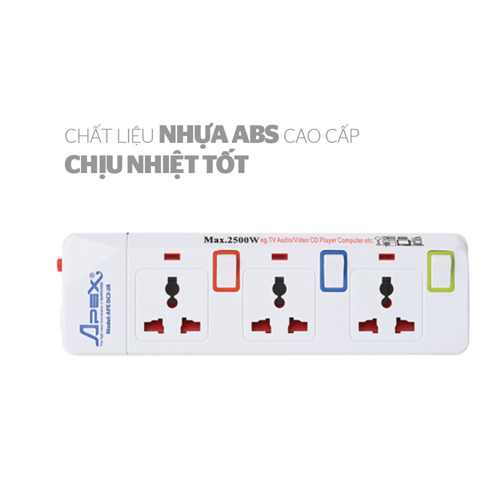 Ổ cắm điện APE-OC2-3R thiết kế nhỏ gọn gồm 3 ổ cắm 3 chấu với 3 đèn báo và công tắc riêng phù hợp với không gian nhỏ và nhu cầu sử dụng ít.