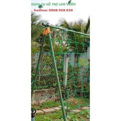 - Bộ khung giàn sản phẩm bao gồm 3 cây chống chữ A lõi thép bọc nhựa phi 16 , 1 cây kết nối dài 180cm, 2 tấm lưới ô vuông 10cm*10cm, 10 cái kẹp lưới vào chân chống trụ