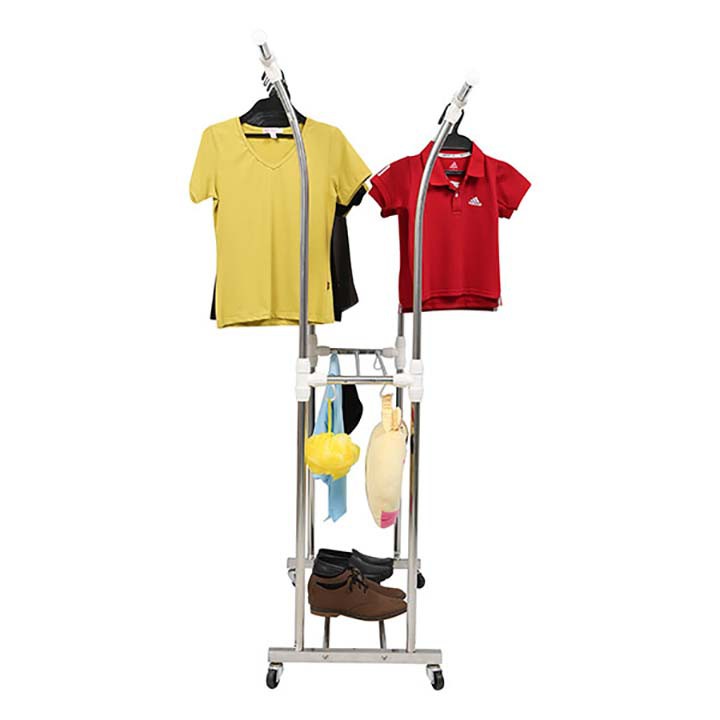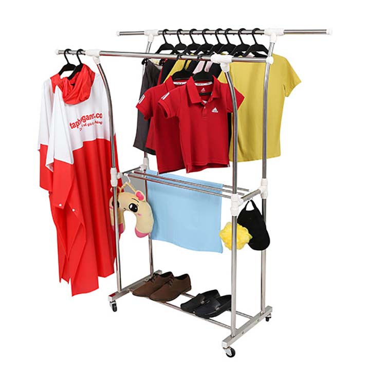 - Dạng giàn phơi đôi, giúp bạn treo được nhiều đồ hơn. Ở giữa có thanh treo khăn, bên dưới có kệ phơi giày dép tiện lợi.