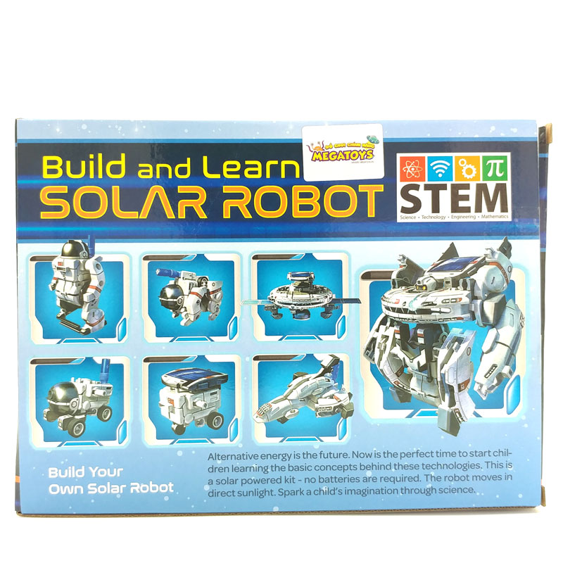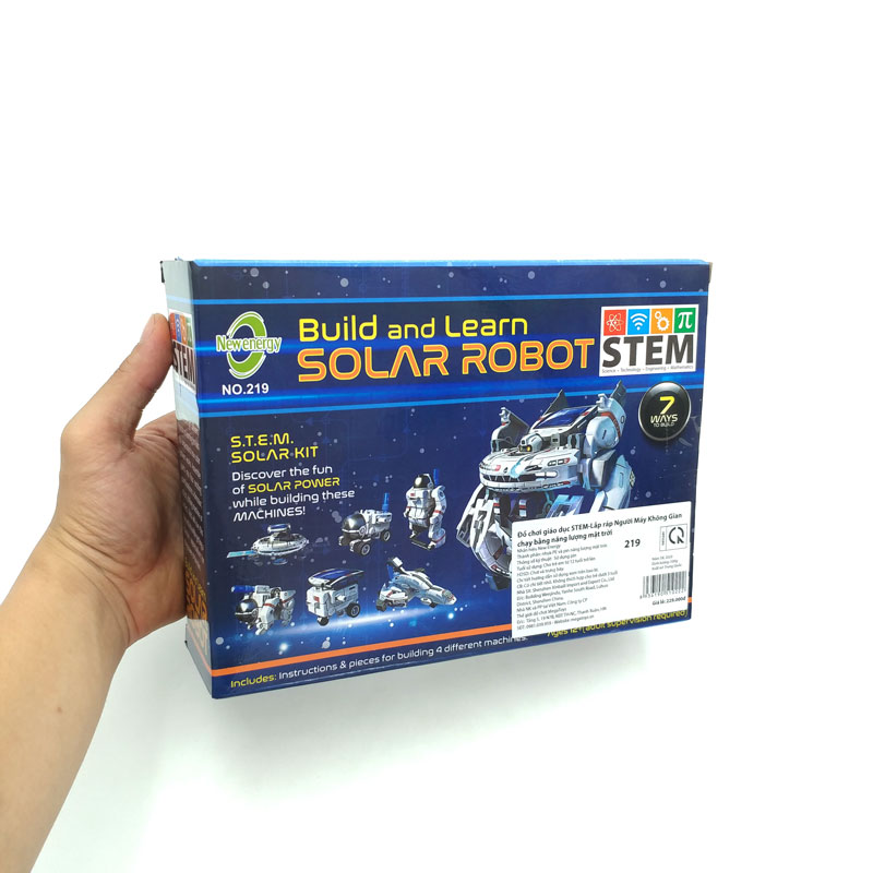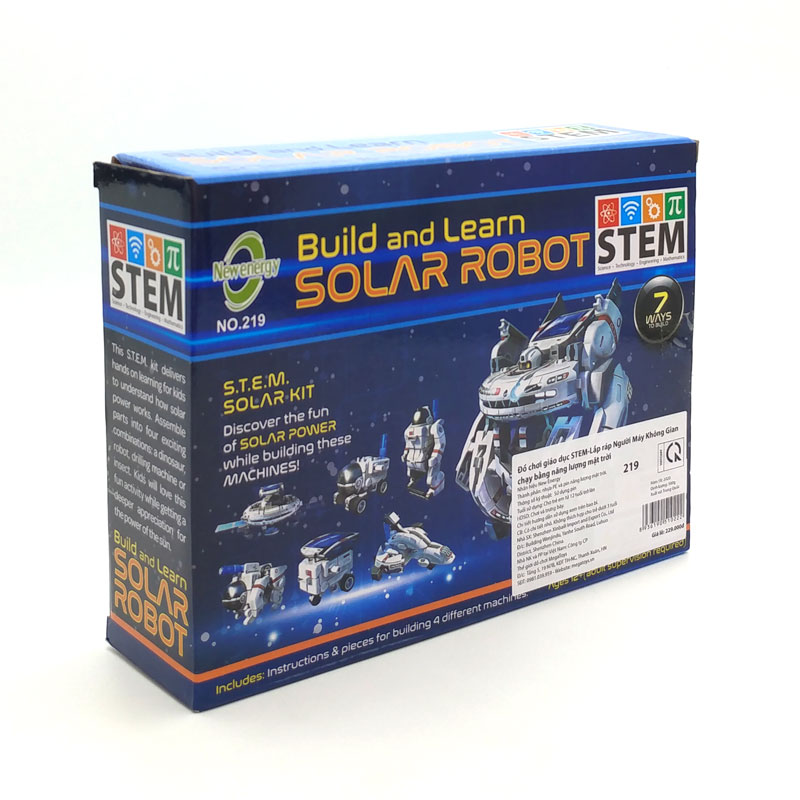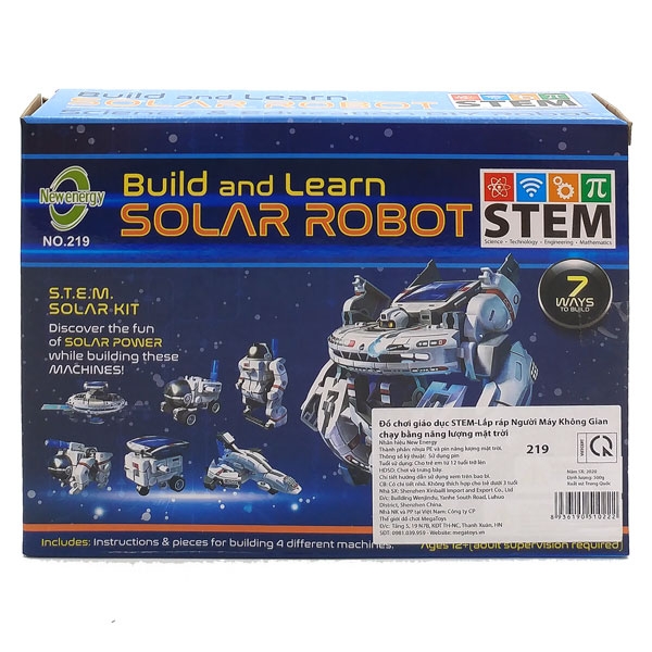 Đồ Chơi Giáo Dục STEM - Lắp Ráp Người Máy Không Gian Chạy Bằng Năng Lượng Mặt Trời 219 Bộ đồ chơi lắp ráp người máy không gian siêu hiện đại Chất liệu: nhựa, kim loại, điện tử. Gồm: 2 vỉ chứa các chi tiết lắp ráp, bảng pin năng lượng mặt trời, decal dán, các bánh răng, sách hướng dẫn bằng hình và tiếng Anh dễ hiểu. Dành cho trẻ trên 8 tuổi. Sử dụng bảng pin năng lượng mặt trời, hấp thu năng lượng từ ánh nắng hoặc đèn Halogen. Độ mạnh, nhanh của động cơ phụ thuộc vào cường độ ánh sáng