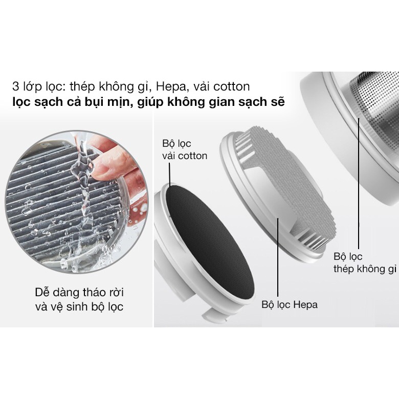 ● Hệ thống lọc 3 lớp: Nhờ công nghệ tách lốc xoáy bên trong, ban đầu các hạt bụi lớn bị chặn lại, sau đó phần còn lại được lọc từng bước qua mô-đun lọc 3 lớp.