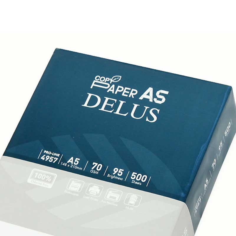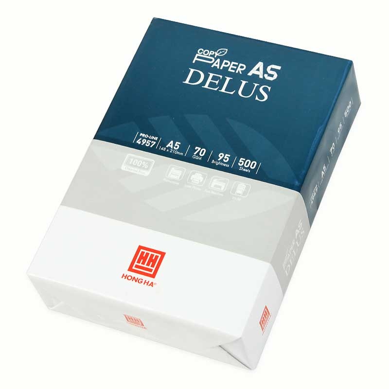 Giấy Photo A5 Định Lượng 70 Gsm Delus Hồng Hà 4957 Thiết kế sang trọng và chuyên nghiệp, dành riêng cho khối văn phòng cao cấp. Sản phẩm ưu việt và chất lượng: Đạt trắng 95% cao nhất thị trường. Giấy không bụi, giúp đảm bảo sức khỏe người sử dụng và tăng độ bền của máy in, máy photo. Phù hợp với đa dạng thiết bị máy in, máy photo và đa dạng mục đích sử dụng. Thân thiện với môi trường 100% Chlorin free (không hóa chất tẩy trắng). Hỗ trợ người dùng với các tính năng lấy giấy ra khỏi thùng dễ dàng, không gây xước tay hay gấp nếp.