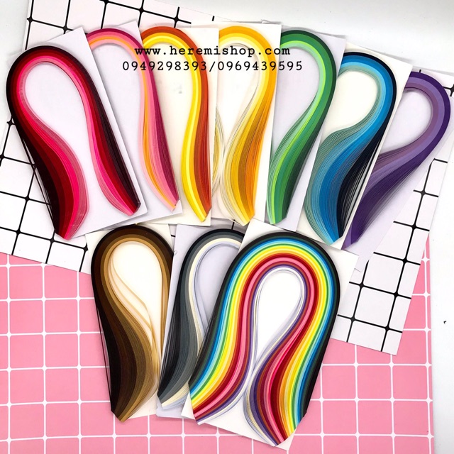 Giấy quilling đủ tông màu:- Tập giấy theo tông: mỗi tập có 100 sợi, gồm 9 gam màu cùng tông, mỗi sợi dài 39cm, rộng 5mm—>10k/tập