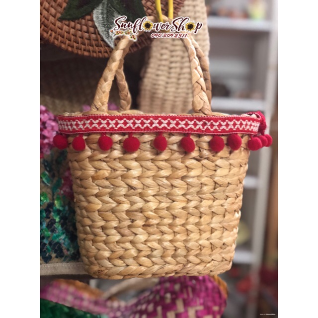 Kích thước N19cm D15cm R10cm có thể cầm tay hoặc dây đeo chéo.Túi lục bình trang trí dây tua rua pom pom đỏ ấn tượng.
