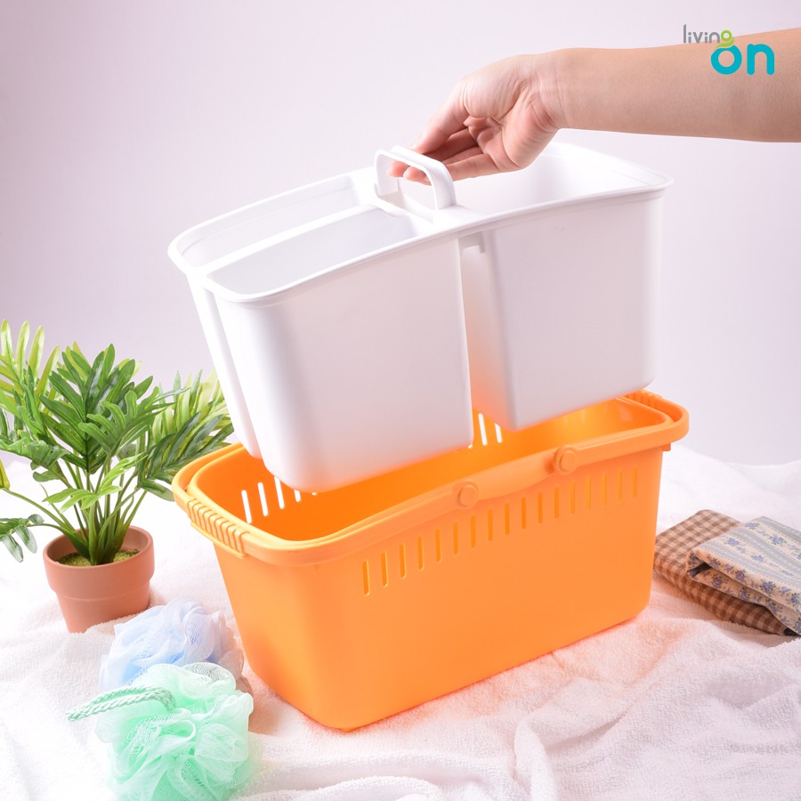 Thiết kế 2 trong 1: bên trong là giỏ màu trắng gồm 3 ngăn, bên ngoài là giỏ màu cam