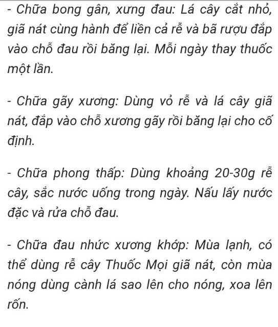 - Chữa đau nhức xương khớp: Mùa lạnh, có thể dùng rễ cây Thuốc Mọi giã nát, còn mùa nóng dùng cành lá sao lên cho nóng, xoa lên rốn.