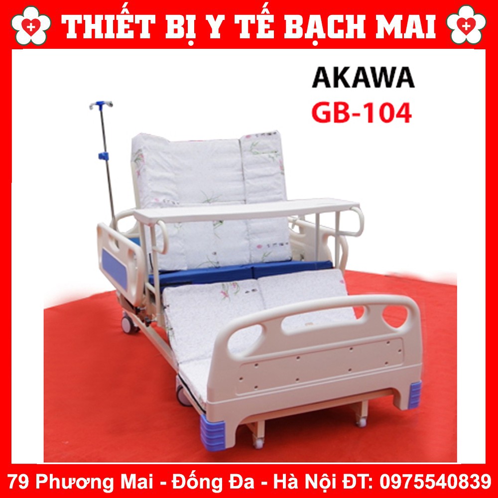 Giường Akawa GB-104 là giường đa chức năng điều khiển bằng điện và có tay quay phụ sử dụng khi không có điện. Giường có đầy đủ các chức năng cần thiết của người bệnh và người chăm sóc.