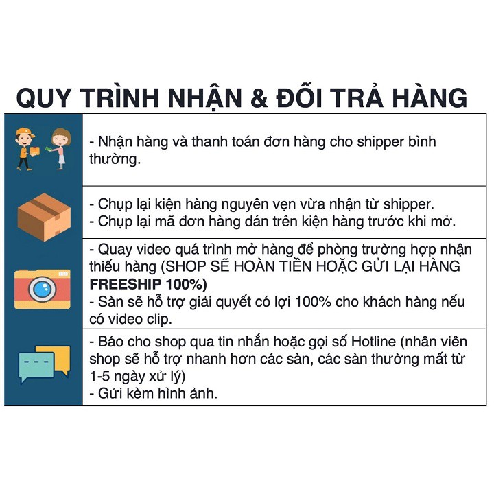 - SHOP KHÔNG NHẬN ĐẶT HÀNG QUA TIN NHẮN. Sản phẩm đã được phân loại rất rõ ràng. Phân loại hàng nào không chọn được có nghĩa là HẾT HÀNG . Sản phẩm nào không có phân loại thì sẽ giao ngẫu nhiên. Quý khách hãy đọc kĩ mô tả sản phẩm trước khi mua, trong mô tả có đầy đủ thông tin cần thiết.
