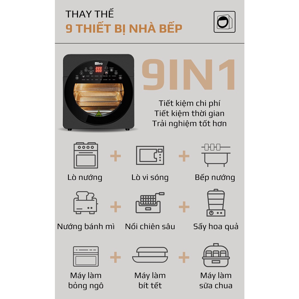 Giới thiệu Nồi chiên không dầu OLIVO 15L 9 chức năng nấu đa năng thay thế các thiết bị nhà bếp nấu ăn tự động chuyên nghiệp
