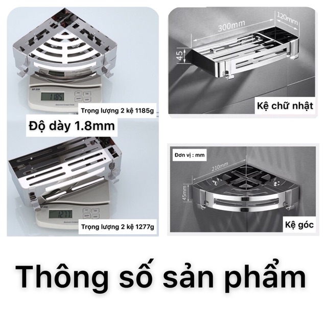Chi tiết sản phẩm:-Chất liệu Inox 304 dày dạn ,cứng cáp ko hoen gỉ, Trọng lượng sản phẩm 700g/kệ , dày 1.8mm