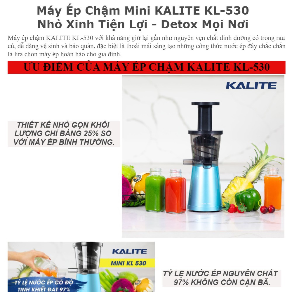 [HÀNG CHÍNH HÃNG] Máy ép chậm KALITE KL- 530, Máy ép trái cây hoa quả MINI, ÉP CỰC ĐÃ SIÊU KIỆT, Ép Hoa Quả, Ép Rau Củ BH 12 thángDA TRẮNG DÁNG XINH Thanh lọc cơ thể bằng những loại nước ép trái cây THƠM - NGON - GIÀU VITAMIN