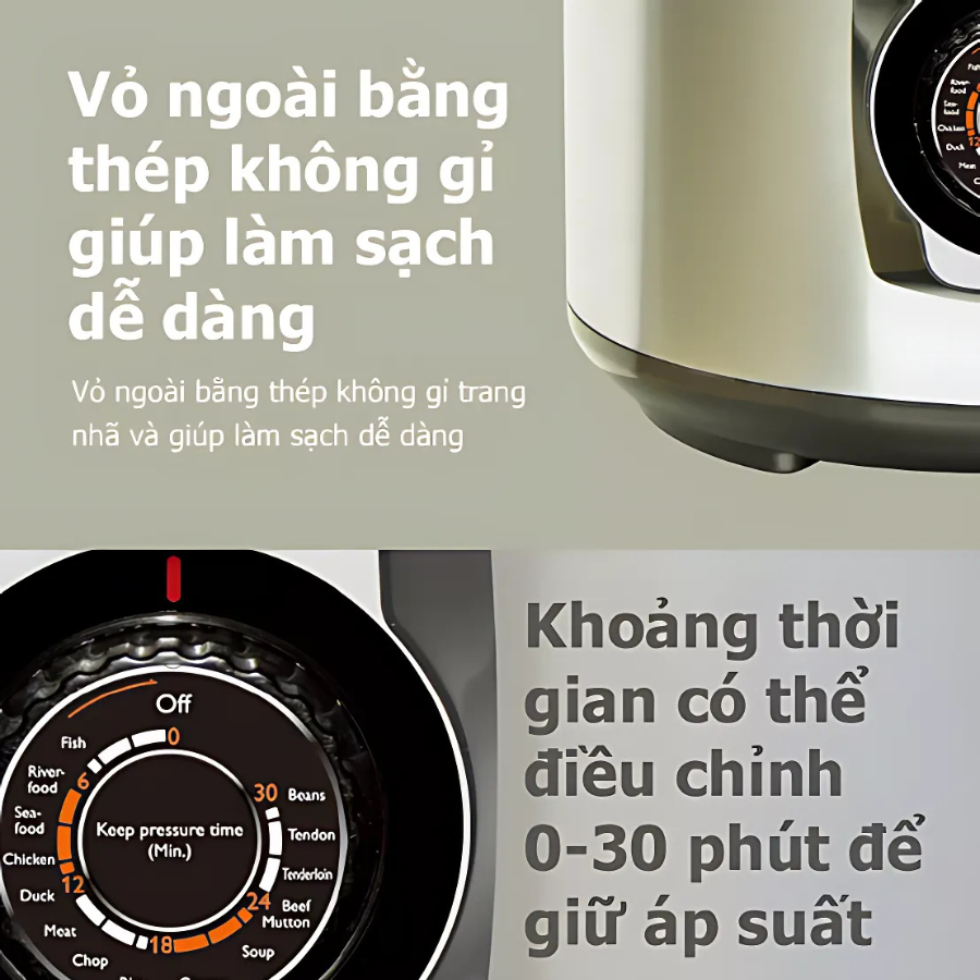 Van xả áp suất tự động & hệ thống an toàn: Khóa nắp khi áp suất cao, tự ngắt khi quá nhiệt, đảm bảo an toàn tuyệt đối.