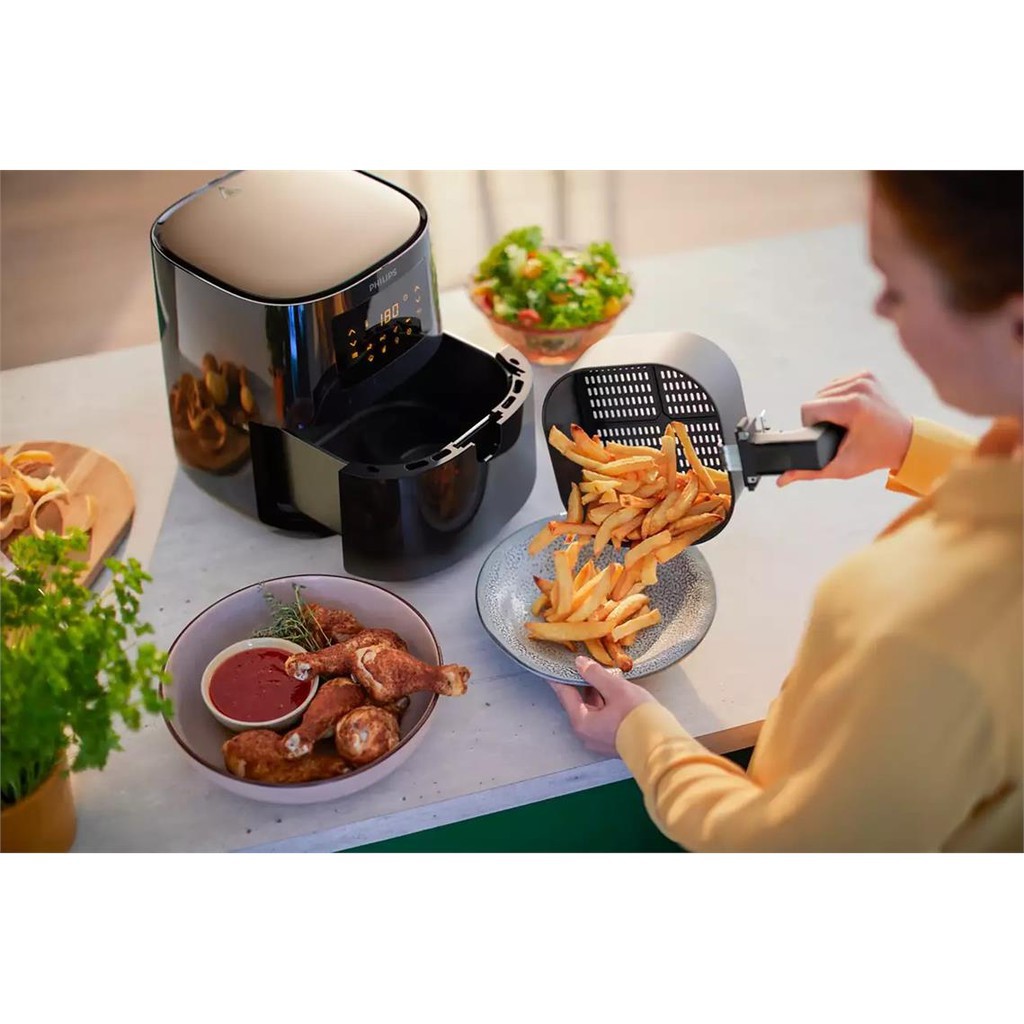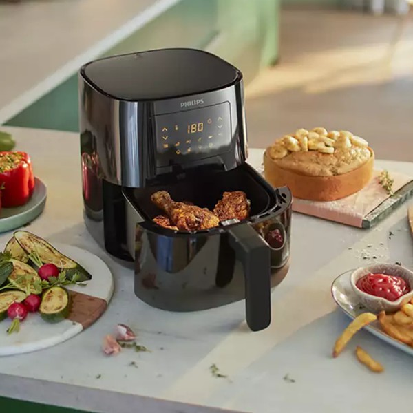 Philips Essential Airfryer sử dụng không khí nóng để nấu các món ăn yêu thích của bạn đến độ giòn ngon mà ít chất béo hơn đến 90%.