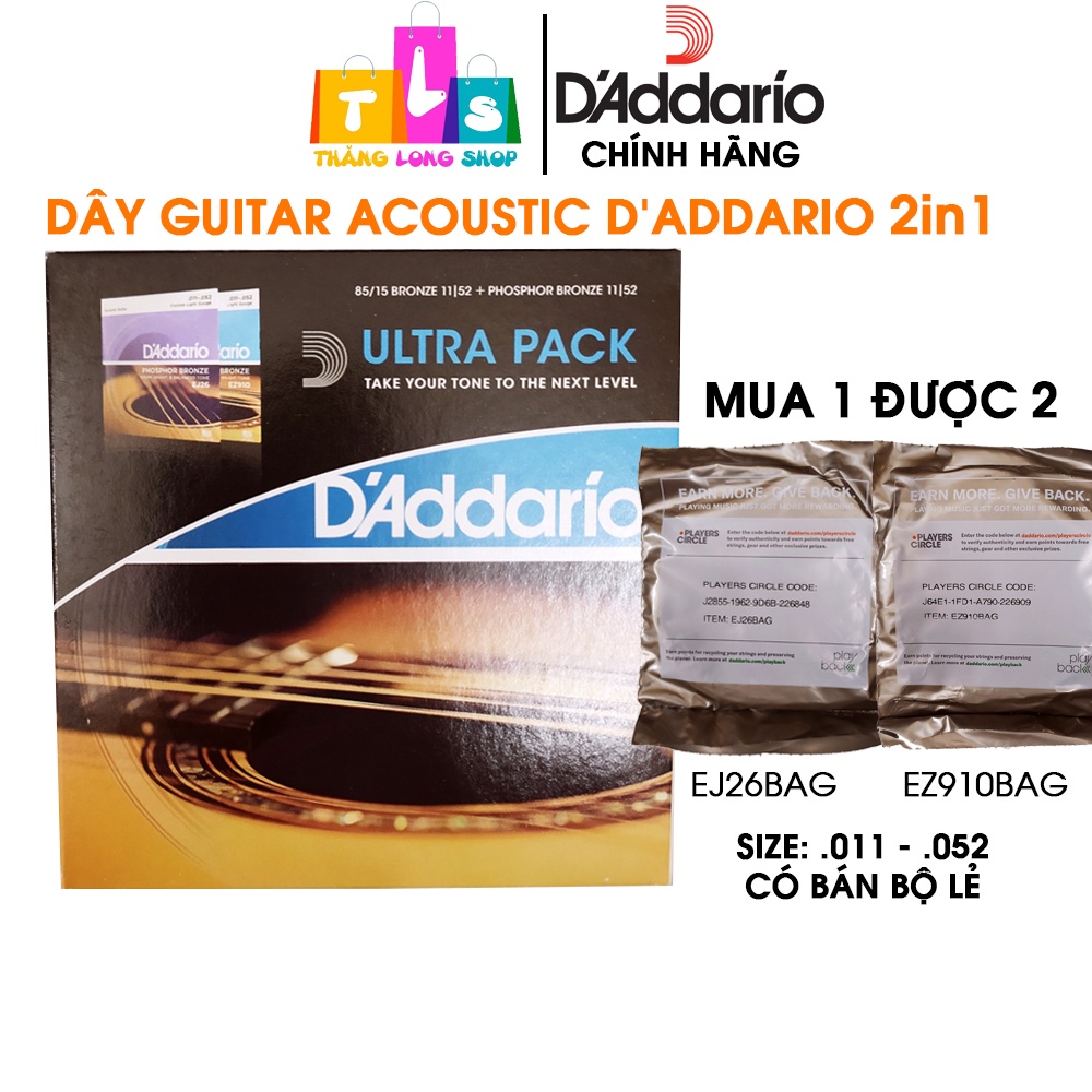 Tri ân khách hàng hãng D'ADDARIO sản xuất combo 2 trong 1 EJ-26 và EZ910,nhưng để phục vụ đúng nhu cầu khách cần dùng shop có tách lẻ,khách vui lòng đọc kỹ thông số dây để chọn phân loại giúp shop!Và hàng tách lẻ sẽ ko có bao bì giấy nhé ạ!* Dây Guitar Acoustic - D'Addario EJ26 là dòng sản phẩm dây phosphor pha đồng (Phosphor-Bronze) của hãng D'Addario (Mỹ), kích cỡ 11-52, loại Customer Light (độ căng của các dây không giống nhau, hai dây cao - dây treble - có độ căng thấp hơn hai dây giữa với mục đích vừa tạo được chất âm sâu cho tiếng đàn vừa giúp người chơi dễ dàng bend nốt)