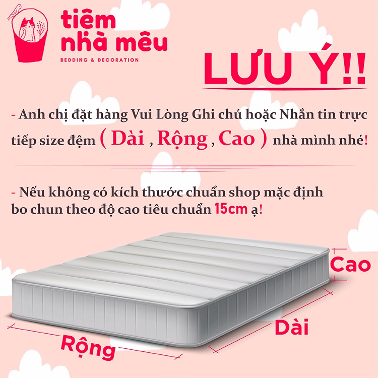 - Khách đặt hàng chọn phân loại và để lại lời nhắn mẫu mình chọn hoặc nhắn tin để shop note mẫu nhé. Lưu ý đặt đúng kích thước ga giường, nên đo lại kích thước giường, nệm trước khi đặt hàng.