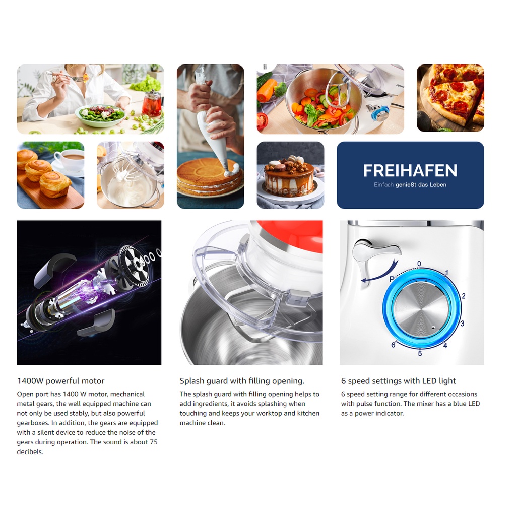 Giới thiệu (Chính hãng Đức) Máy nhào bột FREIHAFEN 5.5L 1400W của Đức - Đánh trứng trộn bột trộn salad- Hàng chính hãng