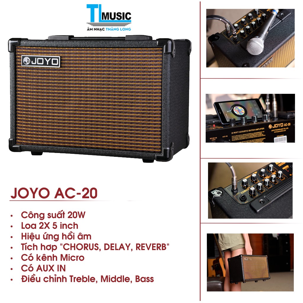 - Các đặc điểm chính Ampli Guitar Acoustic Joyo AC-20JOYO AC-20 là bộ khuếch đại được thiết kế với mạch đường cong đặc tính khuếch đại dành riêng cho guitar acoustic. Nó mang đến cho bạn âm bổng tuyệt vời và sáng sủa với tần số âm trung phong phú.
