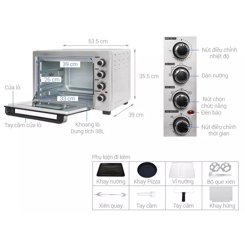 ● Tặng kèm lò có khay nướng, khay Pizza, khay hứng, vỉ nướng, xiên quay, tay cầm xiên quay, tay cầm khay nướng