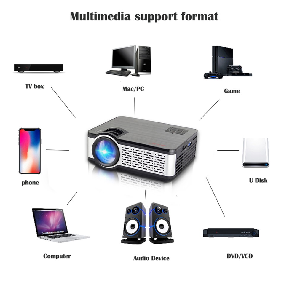Hỗ trợ HDMI USB TF giắc cắm tai nghe AV có thể được liên kết với điện thoại di động, máy tính, dàn âm thanh nổi, đĩa U và ổ cứng di động. Máy chiếu siêu nhỏ, dễ dàng mang theo nhưng có thể lắp đặt với kích thước 100 inch là lựa chọn tốt để xem phim tại nhà, mang đi du lịch hay trình chiếu nội dung trong các cuộc họp.