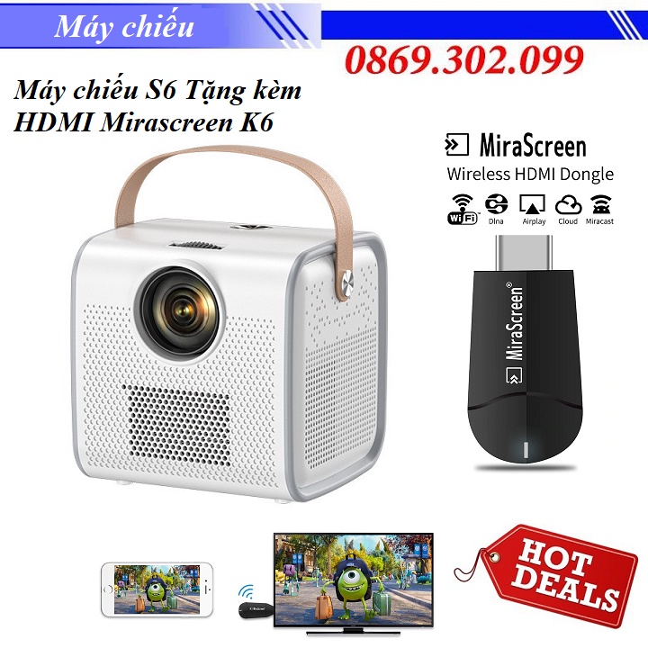[ Chính hãng ] Máy chiếu Mini hỗ trợ tiếng Việt Chạy Android S6 Tặng kèm Thiết Bị HDMI Không Dây Cao Cấp Mirascreen K6