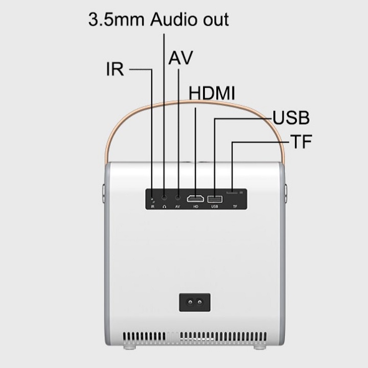 Hỗ trợ HDMI USB TF giắc cắm tai nghe AV có thể được liên kết với điện thoại di động, máy tính, dàn âm thanh nổi, đĩa U và ổ cứng di động. Máy chiếu siêu nhỏ, dễ dàng mang theo nhưng có thể lắp đặt với kích thước 100 inch là lựa chọn tốt để xem phim tại nhà, mang đi du lịch hay trình chiếu nội dung trong các cuộc họp.