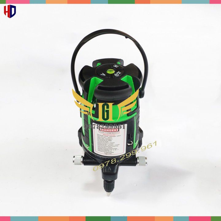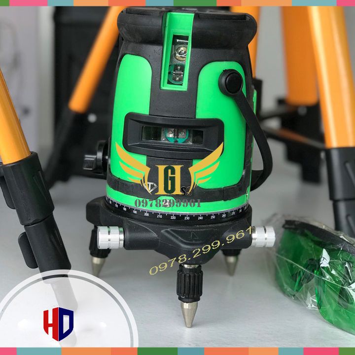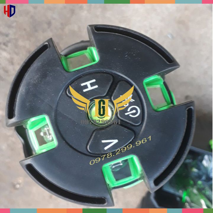 + Đầu ra tia laser màu xanh 4 tia ngang, 1 tia dọc vuông góc nhau, 1 chấm laser dọi xuống