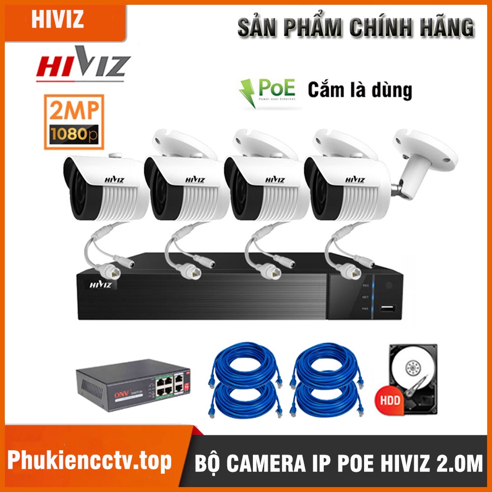 [Chính Hãng] Trọn Bộ Camera giám sát 4 Kênh IP POE Hiviz 2.0mp FULL HD 1080P, Đầy đủ phụ kiện cắm là chạy