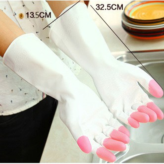 Găng tay cao su với thiết kế thông minh, chiều dài vừa phải, vừa đủ để tránh bị ướt áo hay nước bắn vào trong, và không quá dài để gây khó khăn, bất tiện trong thao tác vệ sinh.