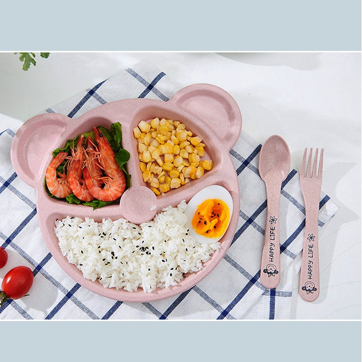 HCM - Khay cơn lúa mì thiên nhiên hình gấu 5 ngăn kèm muỗng nĩa cho bé