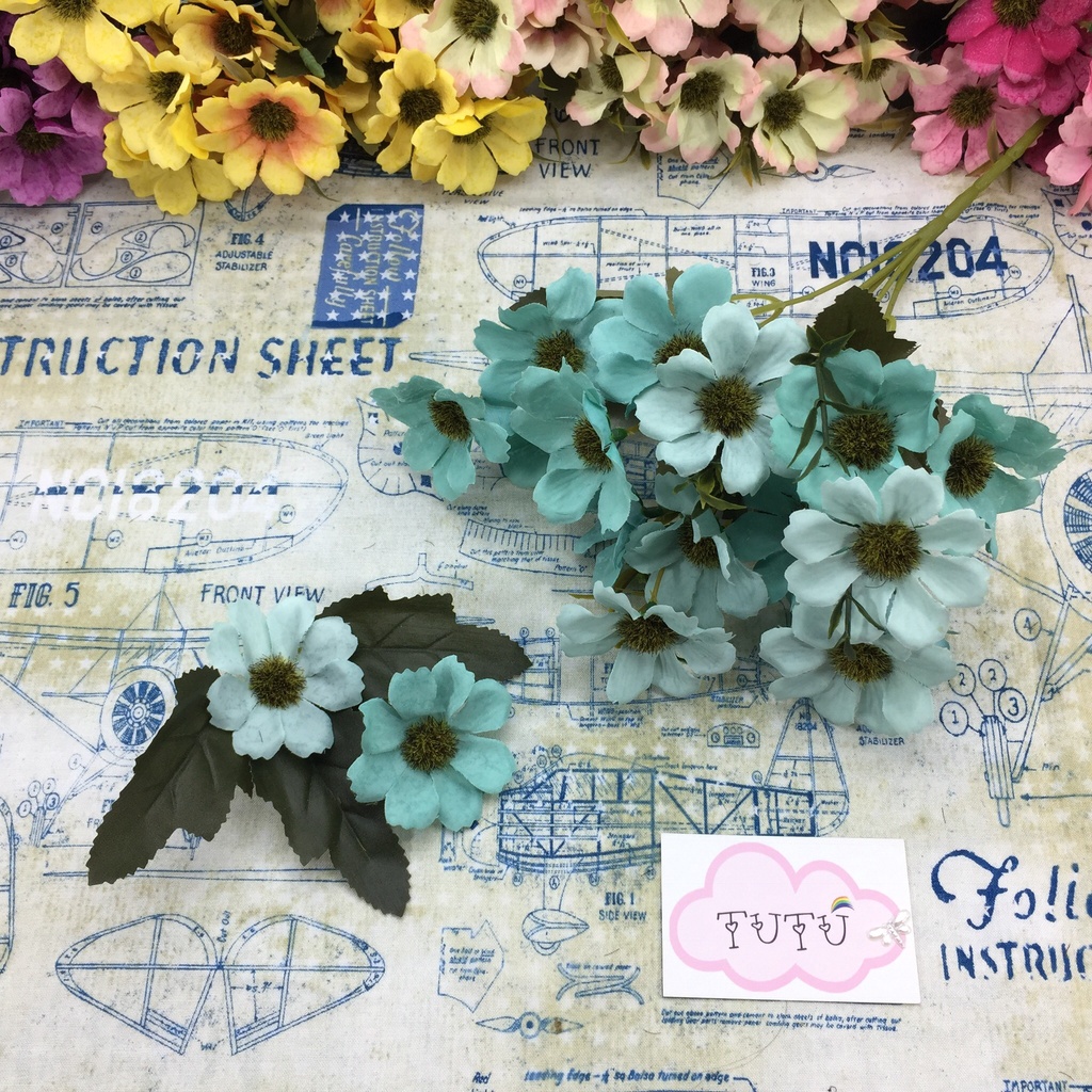 Cúc một lớp cánh nguyên cành, có thể dùng cắm trực tiếp vào lọ hoa trang trí hoặc chỉ dùng đầu hoa và lá để làm đồ handmade, trang trí váy áo ...Ngoài màu trắng, mỗi chùm hoa đều được pha màu hài hoà, dễ sử dụng. Một chùm có 5 cành, tổng 15 đầu hoa kích thước 6-6.5cm và 8 màu để lựa chọn: trắng, hồng kem, kem tím, tím đậm, hồng đậm, đỏ tươi, xanh ngọc và vàng tươi