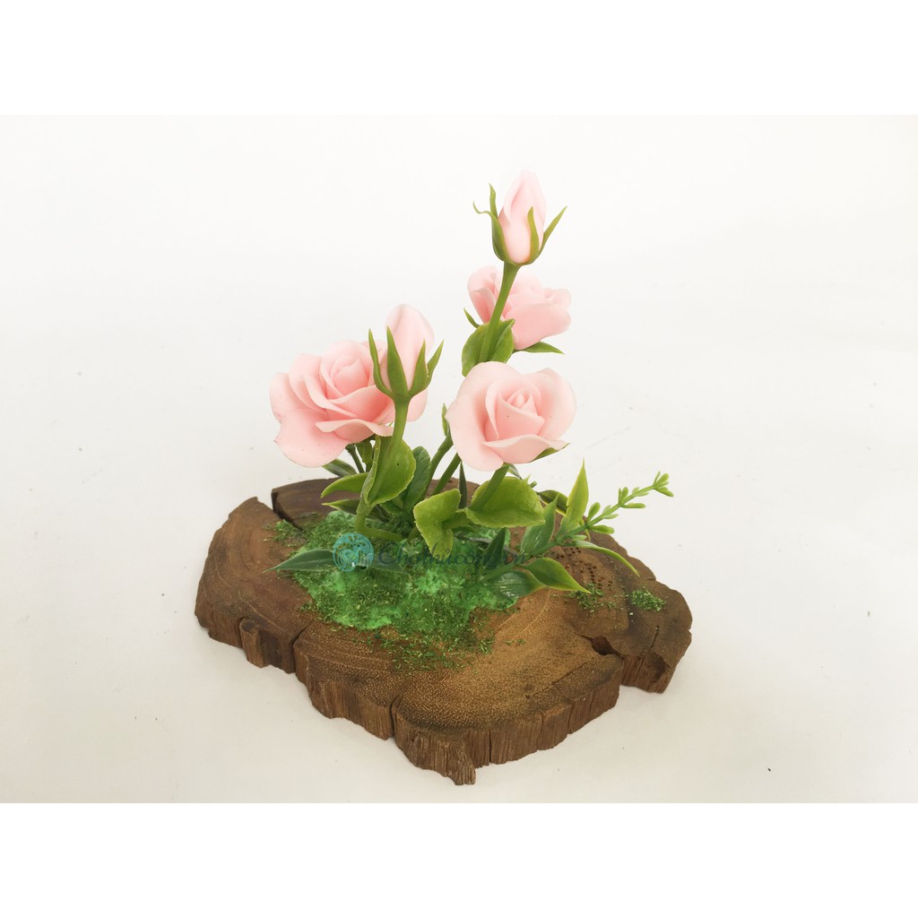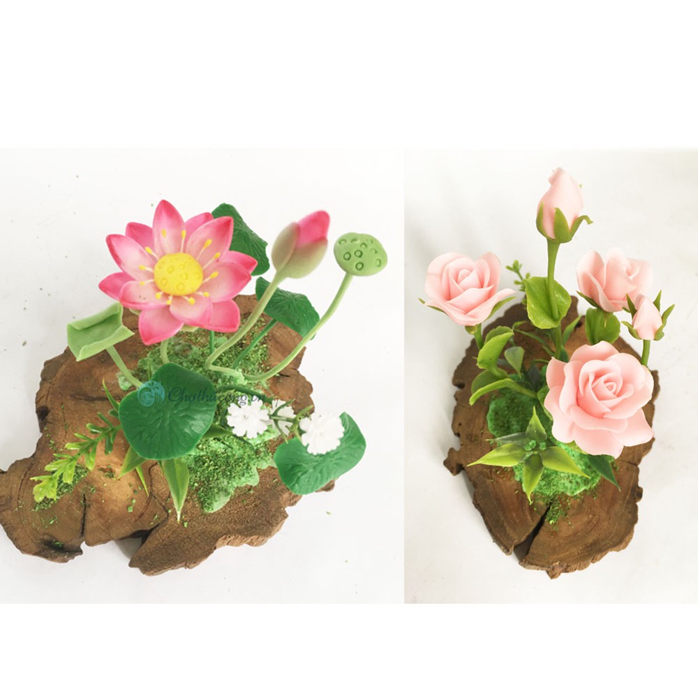 Hoa đất sét mini Hoa hồng - Hoa sen handmade kết hợp khoanh gỗ tự nhiên vintage