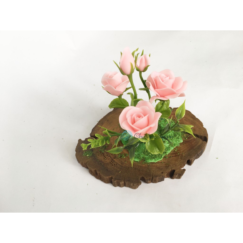 Giới thiệu Hoa đất sét mini Hoa hồng - Hoa sen handmade kết hợp khoanh gỗ tự nhiên vintage
