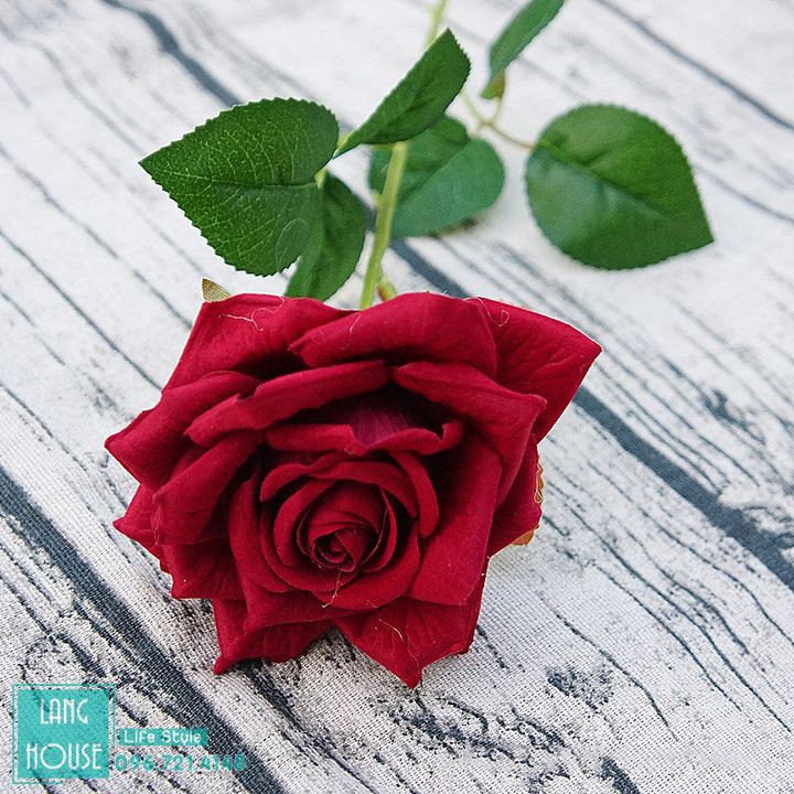 Cánh hoa xếp lớp dày, vải nhung cứng nhưng tạo hình mềm mại. cánh, lá, hoa tạo hình tỉ mỉ như thật