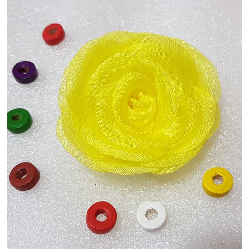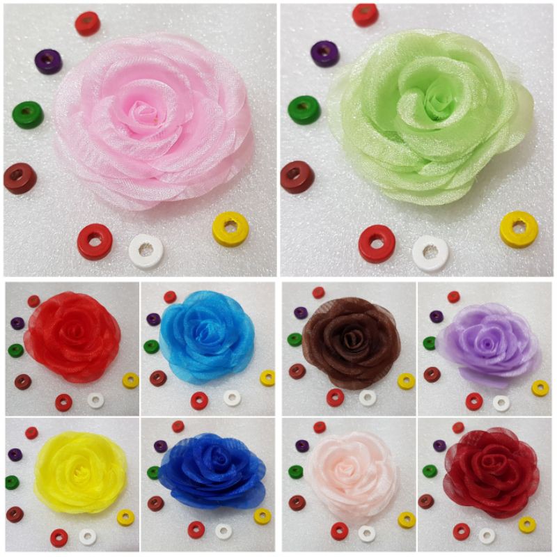 Hoa hồng voan 6cm có nhiều màu sắc dùng trang trí đầm, nón, túi..... v.vGiá 7k/ 1 bông.