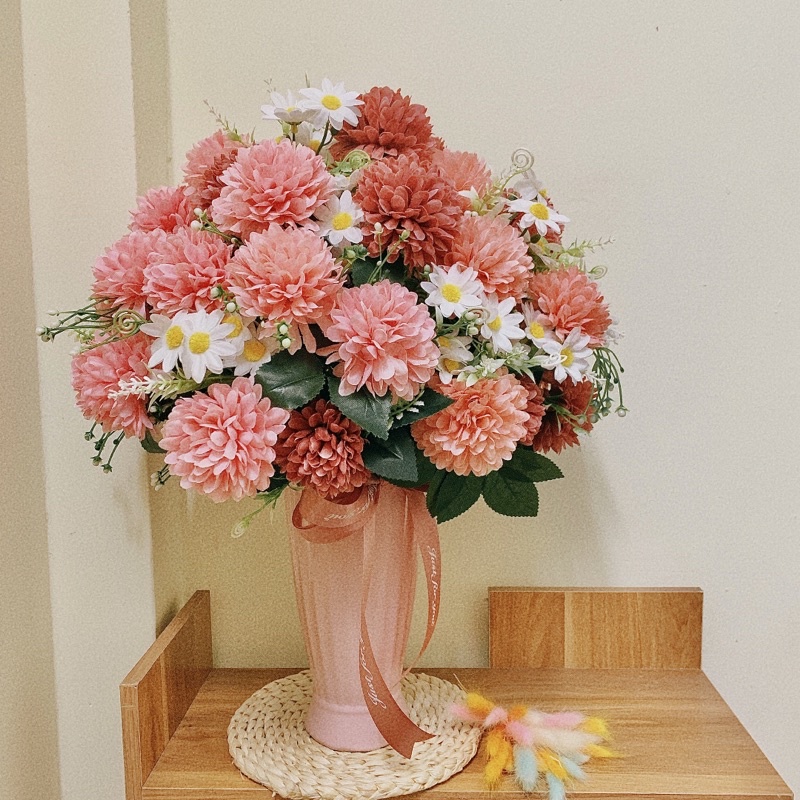 Giới thiệu Hoa lụa, bình hoa bồ công anh,hoa hồng trà cắm sẵn cao 45 cm trang trí nhà cửa,nhà hàng, spa sang trọng