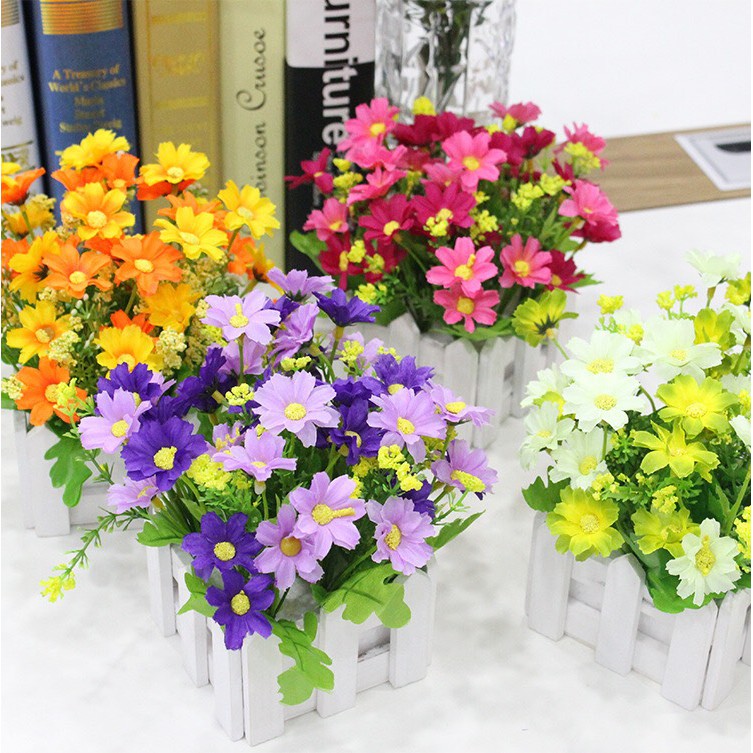 Hoa lụa, giỏ hoa cúc dại xinh tươi cắm sẵn hàng rào gỗ trang trí bàn học, bàn làm việc, kệ tủ 10cm