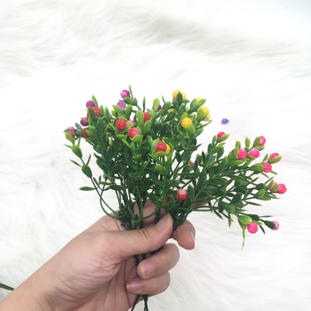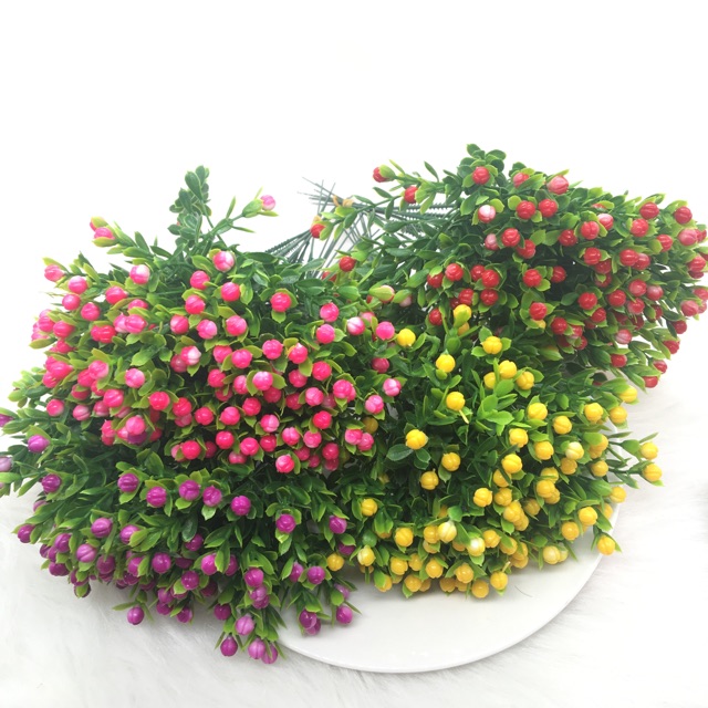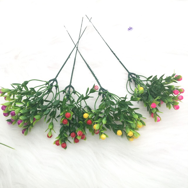 Hoa nhựa trang trí mẫu 2 bên tớ đây ạ. Hoa dùng để cắm điểm lọ hoa giả, điểm bó hoa sáp, hoa giấy nhún...Giá bán 8k/cành như ảnh t2. Có sẵn 4 màu như ảnh. Khách chọn màu theo phân loại hàng ạ.