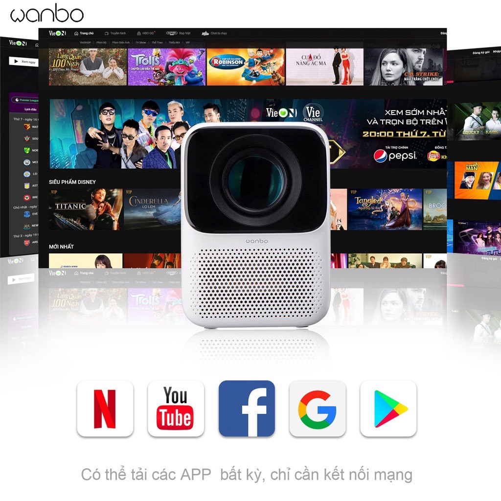 - Máy chiếu Wanbo T2 Max (bản quốc tế) không bị hạn chế ứng dụng dễ dàng cài đặt các ứng dụng phổ biến như: Youtube, Facebook, Netflix, Google Chrome,vv... và máy còn được tích hợp sẵn kho cài đặt ứng ứng trực tuyến, người dùng có thể dễ dàng tìm kiếm các ứng dụng mình cần (như: VTV Go, FPT Play, Zing TV,...) và có thể hoàn thành cài đặt chỉ trong vài phút.
