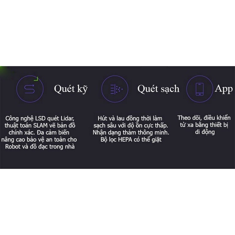 ✔ Được trang bị cảm biến đa chức năng xung quanh thân máy cùng với công nghệ LDS Lidar kết hợp với các thuật toán SLAM để vẽ bản đồ chính xác, tránh va chạm và lên kế hoạch di chuyển làm sạch thông minh.