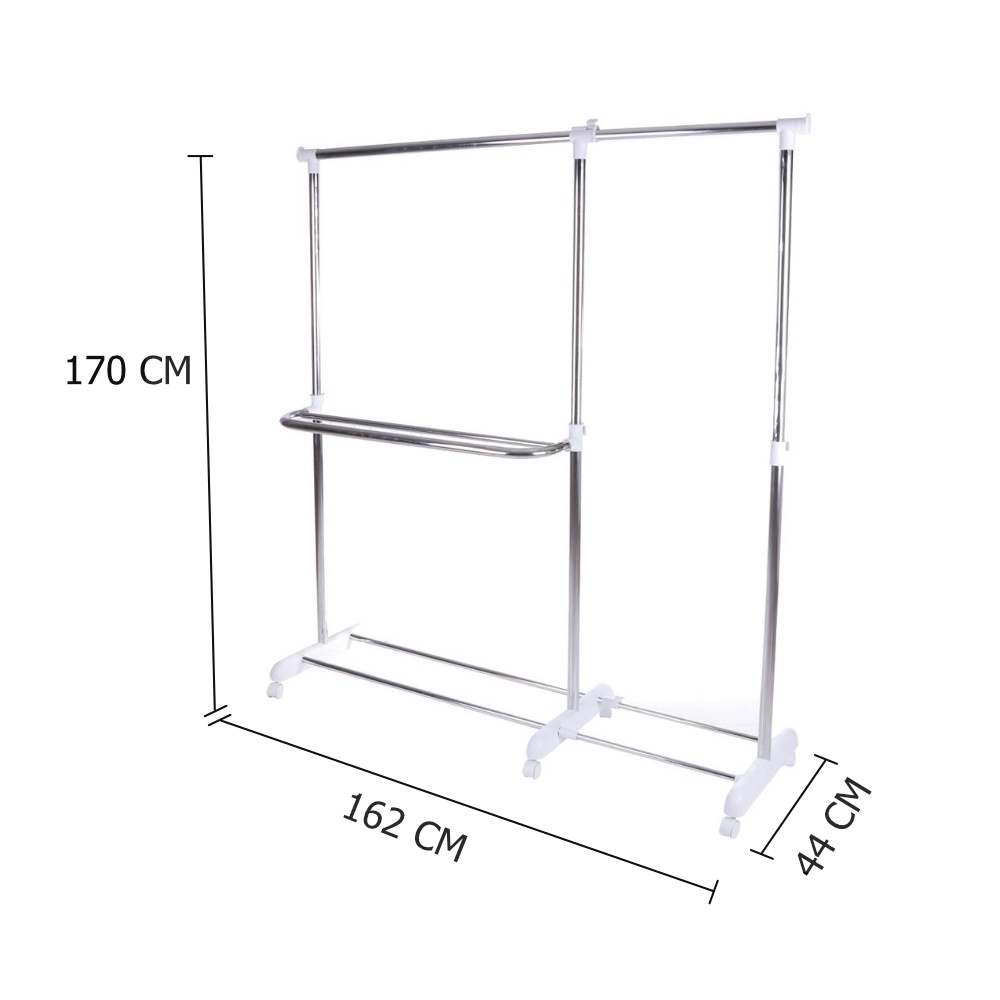 - Chiều rộng và chiều cao của giá có thể điều chỉnh lần lượt từ 107-170 cm và 93,5-155 cm để phù hợp với nhiều loại quần áo