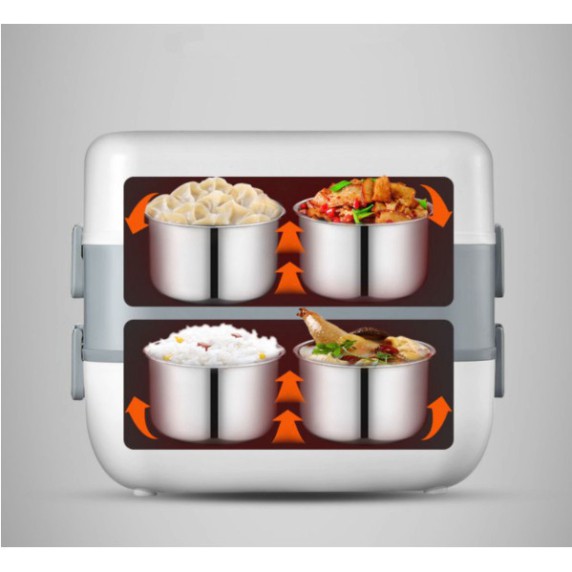 Hộp cơm cắm điện hâm nóng, 2 tầng 4 ngăn, công suất 200W đa chức năng nấu cơm, hầm, hâm_VimartMột sản phẩm tiện lợi và đa năng cho những bạn thường dậy muộn và không kịp nấu thức ăn chín mang đi làm thì với chiếc hộp cơm này bạn chỉ cần sơ chế thực phẩm, phân chia vào từng hộp và bấm nút, nó sẽ giúp bạn làm chín nhiều món ăn cùng lúc.