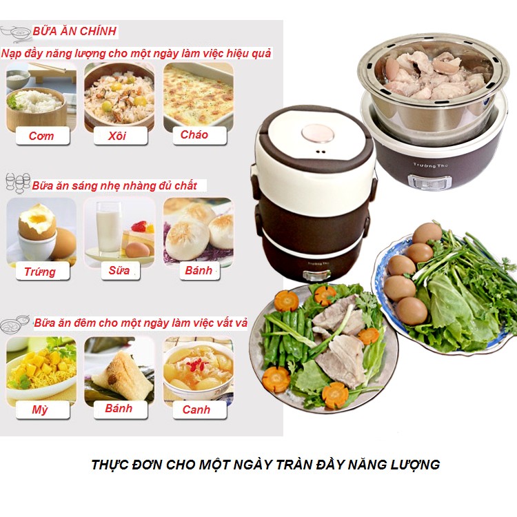 ĐẶC ĐIỂM NỔI BẬT.Chất liệu cao cấp, an toàn sức khỏe.Hộp cơm điện 3 tầng Trường Thọ BA 2019A Den được thiết kế từ.chất liệu inox 304 và nhựa PP cao cấp nên sở hữu độ bền cao, hạn.chế bị biến dạng khi có va chạm, vì thế bạn có thể yên tâm sử dụng.sản phẩm trong thời gian lâu dài. Ngoài ra, chất liệu trên còn giúp.chiếc hộp không bị gỉ sét và hoàn toàn không chứa các chất độc hại.khi sử dụng lâu ngày, đảm bảo an toàn cho sức khỏe của bạn và người.thân trong gia đình..Dẫn nhiệt và giữ nhiệt tốt.Với tính năng dẫn nhiệt tốt và nhanh, hộp cơm điện 3 tầng Trường.Thọ BA 2019A Den làm cho thức ăn chín đều giúp công việc chế.biến thức ăn trở nên nhanh chóng mà vẫn giữ nguyên hương vị thơm.ngon của thức ăn. Ngoài ra, sản phẩm còn giúp bảo quản và giữ nhiệt.tốt vì thế bạn có thể thưởng thức thức ăn sau một thời gian để lâu.trong hộp mà vẫn cung cấp những thức ăn nóng như vừa mới chế.biến..Kiểu dáng hiện đại.Hộp cơm điện 3 tầng Trường Thọ BA 2019A Den có kích thước.nhỏ gọn vì thế bạn có thể mang sản phẩm đến bất cứ nơi nào để sử.dụng, tạo sự linh hoạt và cơ động nhất, sản phẩm phù hợp để bạn.mang theo đi dã ngoại hay có buổi tiệc ngoài trời. Không những thế,.với kiểu dáng hiện đại, hộp cơm còn góp phần mang đến sự cá tính và.sang trọng cho người sử dụng..Thiết kế thông minh.Hộp cơm điện 3 tầng Trường Thọ BA 2019A Den là sự kết hợp.độc đáo của nhiều chức năng vào trong cùng một sản phẩm như: nấu.cơm, luộc trứng, nấu canh,... mang lại sự tiện lợi và nhanh chóng.chưa từng có trong việc nấu nướng. Với thiết kế hình trụ tròn có 1.tầng, sản phẩm cho sức chứa tối đa lên tới 2 lít, đảm bảo cung cấp.không gian chứa thức ăn cần thiết cho nhiều người ăn giúp bạn tiết.kiệm thời gian hiệu quả thay vì phải nấu nhiều lần..An toàn khi sử dụng.Vì được thiết kế sử dụng điện để hoạt động nên hộp cơm điện 3 tầng.Trường Thọ BA 2019A Den sẽ giúp hạn chế các sự cố do lửa gây.ra, tạo sự an toàn tuyệt đối cho người sử dụng. Sản phẩm còn được.trang bị khả năng kiểm soát nguồn điện, góp phần hạn chế các sự cố.về điện xảy ra trong quá trình sử dụng..Hướng dẫn sử dụng Nồi.cơm văn phòng đa năng 3 tầng:..1.a, Nấu thức.ăn:..Lấy cốc nước đổ vào thân nồi theo một liều lượng khoảng(60ml) để.hâm nóng.(cụ thể tham khảo bảng follwing) Cho các thực phẩm và thức.ăn cần hâm nóng vào lòng nồi hay khay đựng thức ăn rùi đẩy nắp nồi.lên...Tiếp theo căm ngồn điện, bật công tác và chờ thời gian khoảng 15-.20 phút...1.b, Nấu.Cơm:..Lấy cốc nước đổ vào thân nồi theo một liều lượng khoảng(60ml) để.nấu ăn.(cụ thể tham khảo bảng follwing), Cho lượng gạo chưa nấu.chín và lượng nước vào lòng nồi nấu(cụ thể tham khảo bảng.follwing). Sau đó đặt lòng nồi nấu lên thân nồi lại với nhau, sau.đó đậy nắp nồi lên...Tiếp theo căm ngồn điện, bật công tác và chờ thời gian khoảng 30 -.35 phút...1.c,Giá ISP