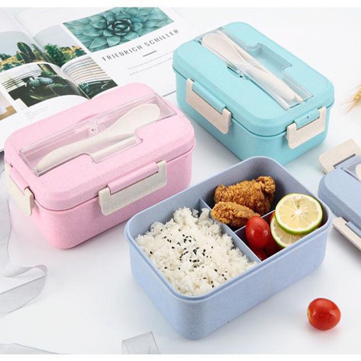 Hộp cơm lúa mạch 3 ngăn mang đi kèm muỗng đũa inox/lúa mì tiện lợi
