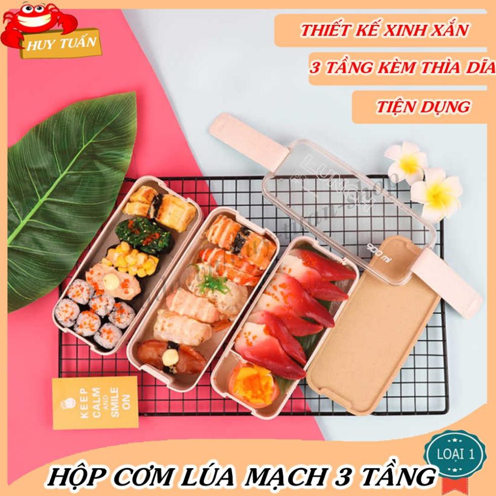 Hộp cơm lúa mạch 3 tầng hình chữ nhật kèm thìa dĩa
