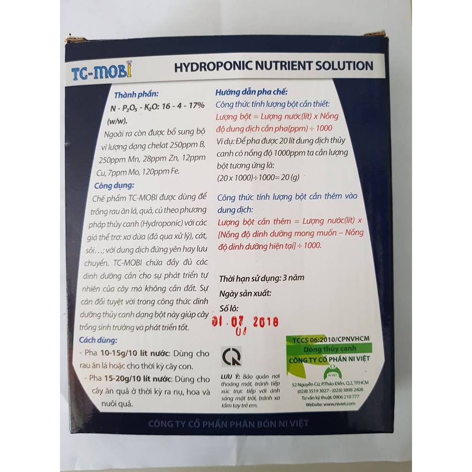 Dinh dưỡng thủy canh dạng bột TC-Mobi gói 500g hoặc 100gThành phần chính: