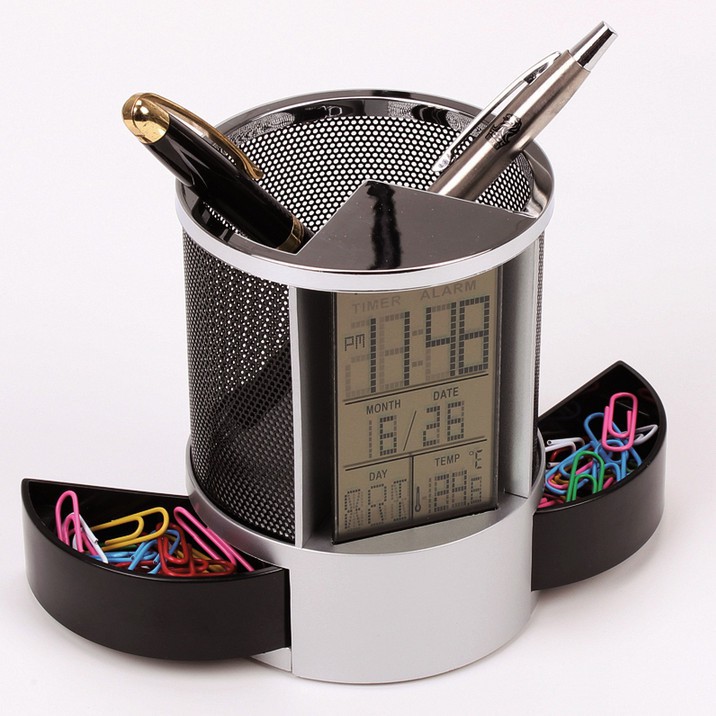Khay đựng bút; dụng cụ văn phòng có đồng hồ