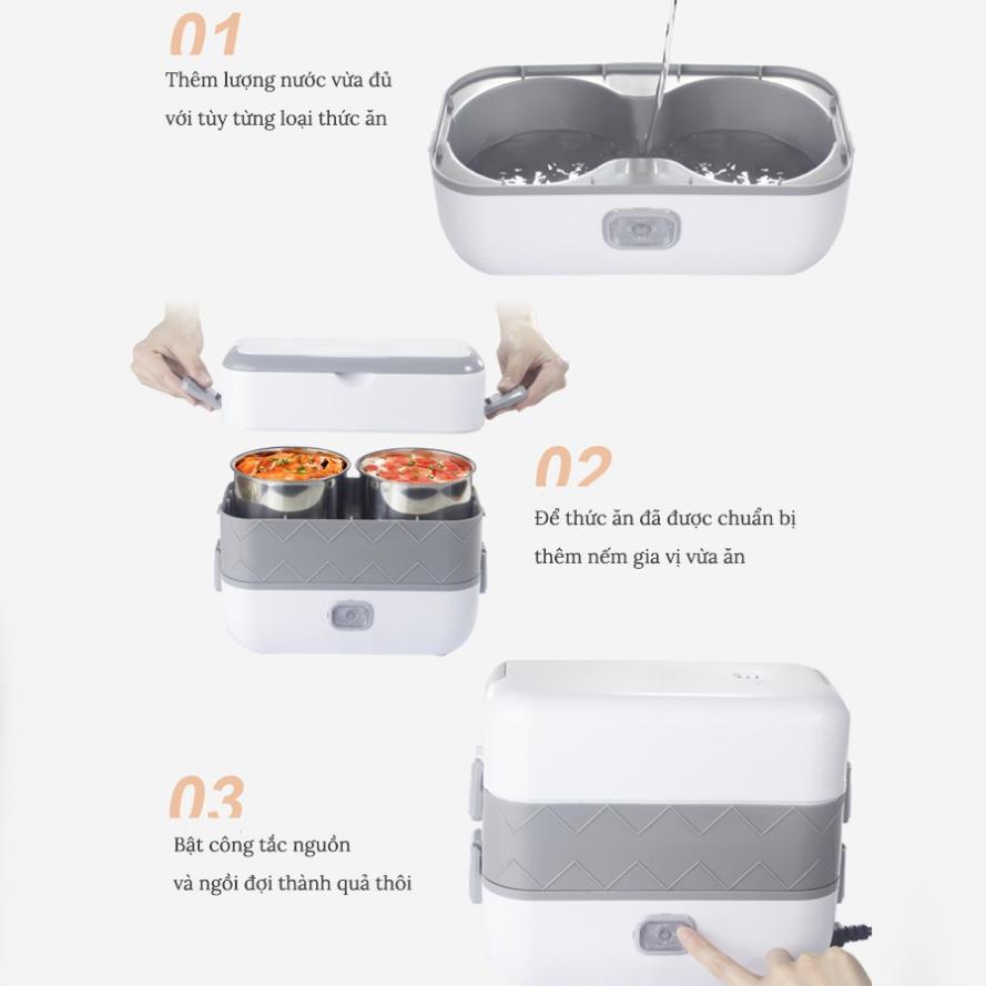 Nấu thức ăn: Cho thức ăn đã chế biến vào các cốc inox -> đổ nước vào khay đế của hộp cơm -> đặt lại khay inox -> Cắm điện khoảng 30p là đồ ăn chín. ( Chú ý lượng nước, tránh trường hợp nước cạn, gây hại thiết bị)