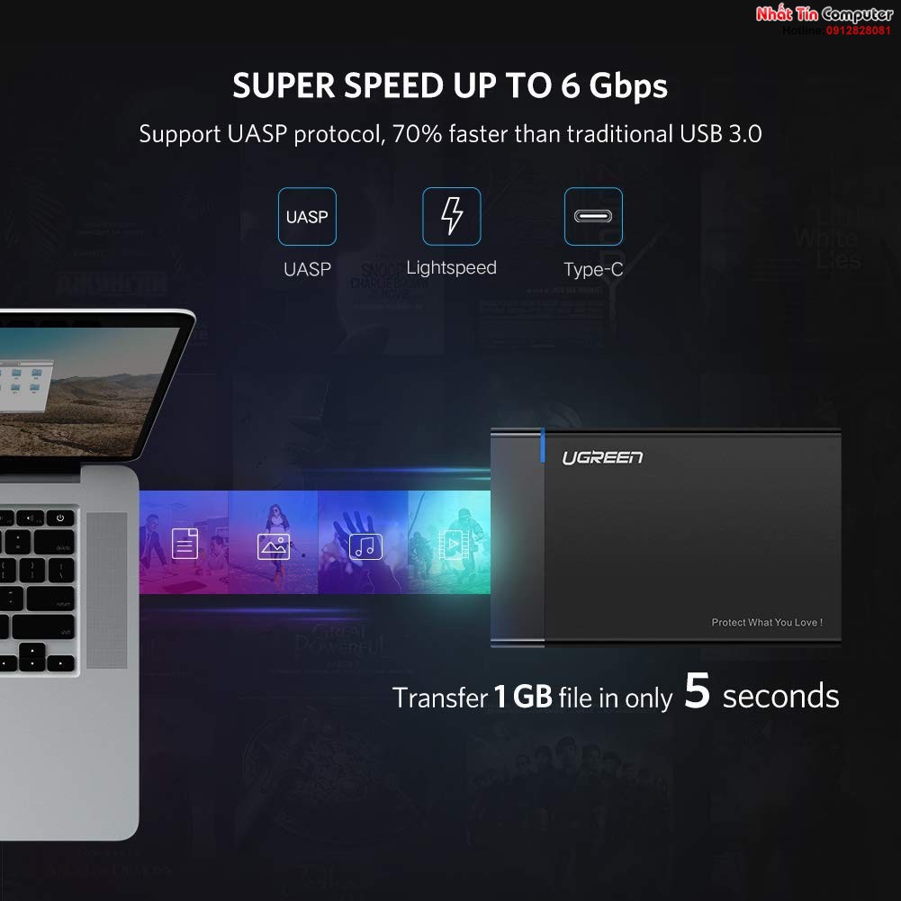 - Hộp đựng ổ cứng Ugreen 50743 Tốc độ truyền tải dữ liệu cao nhất lên đến 6Gbps khi kết nối cổng USB-C.