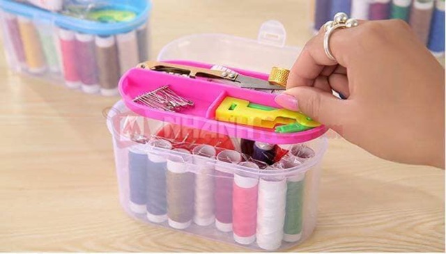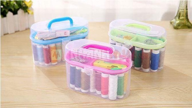 - Bao gồm: cuộn chỉ các màu, kim các loại, kéo cắt chỉ, thước dây, dụng cụ xỏ chỉ, kim băng, cúc bấm, dụng cụ lấy ráy tai, nhẫn ấn kim, hộp nhựa,